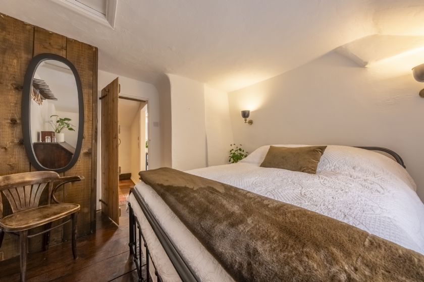 Wake refreshed in this tastefully appointed second bedroom where the classic iron bedstead sits on warm wooden floorboards. The vintage oval mirror and characterful wooden chair add period authenticity, while wall lights provide perfect illumination for bedtime reading.